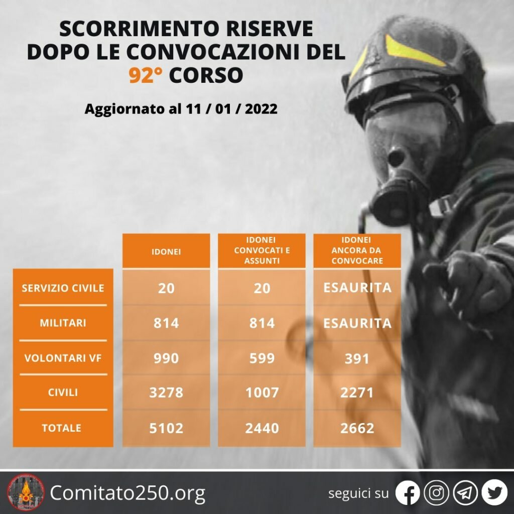 In data odierna è stato pubblicato sul sito istituzionale del Corpo Nazionale Vigili del Fuoco, sezione concorsi di accesso (clicca qui per raggiungere la pagina), l’elenco delle convocazioni a visita medica per un contingente di n° 781 idonei, per i mesi di febbraio, marzo, aprile 2022.