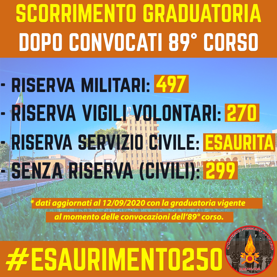 Dopo le convocazioni e successiva immissione nell’89° corso dei nuovi AA.VV.F. in data 03/09/2020, dalle informazioni in nostro possesso, lo scorrimento delle graduatorie è il seguente: