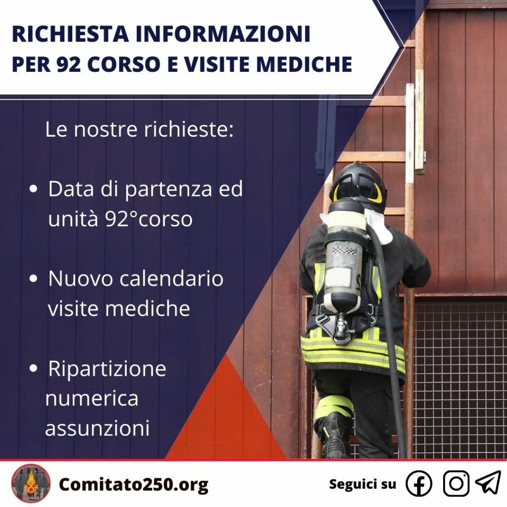 Alleghiamo la richiesta di chiarimento (clicca qui per scaricarla) che il Comitato 250 ha inviato alle organizzazioni sindacali in merito al 92° Corso AA.VV.F. e alle prossime visite mediche.